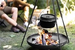 Stellt man den Gusseisentopf nun direkt auf den Grillrost im Grill und schließt den Deckel, heizt sich das Material rundum gleichmäßig auf. Genauso bei der Befeuerung mit glühenden Briketts unter dem Gusstopf und auf dem Deckel. Aber auch eine Befeuerung nur von unten, etwa in einer Feuerstelle, am Dreibein, über dem Feuer oder auf dem Gasherd, sind problemlos möglich, um den Feuertopf zu verwenden.