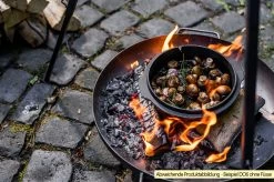 Stellt man den Gusseisentopf nun direkt auf den Grillrost im Grill und schließt den Deckel, heizt sich das Material rundum gleichmäßig auf. Genauso bei der Befeuerung mit glühenden Briketts unter dem Gusstopf und auf dem Deckel. Aber auch eine Befeuerung nur von unten, etwa in einer Feuerstelle, am Dreibein, über dem Feuer oder auf dem Gasherd, sind problemlos möglich, um den Feuertopf zu verwenden.