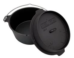 Der massive Gusseisentopf besitzt einen flachen Boden, damit er platzsparend und komfortabel direkt auf dem Grillrost oder dem Herd platziert werden kann. Der Dutch Oven ist dennoch universell einsetzbar und lässt sich selbstverständlich bei Bedarf auch traditionell mit Briketts oder in der Feuerstelle anheizen.
