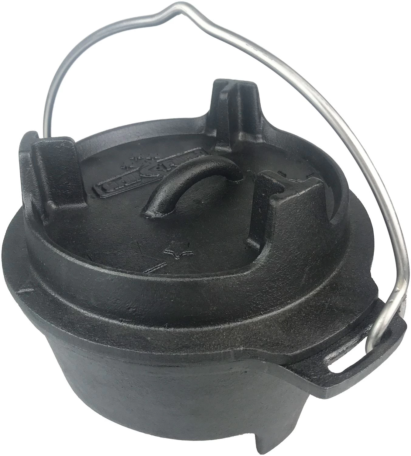 Durch die spezielle Auslegung der Standfüße finden Topf wie auch Deckel (wenn er als Grillpfanne genutzt wird) automatisch und sicher auf jedem Rost zu einem stabilen Stand. Dutch Oven Modelle „ohne Füße“ sind damit nicht mehr notwendig.