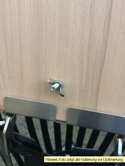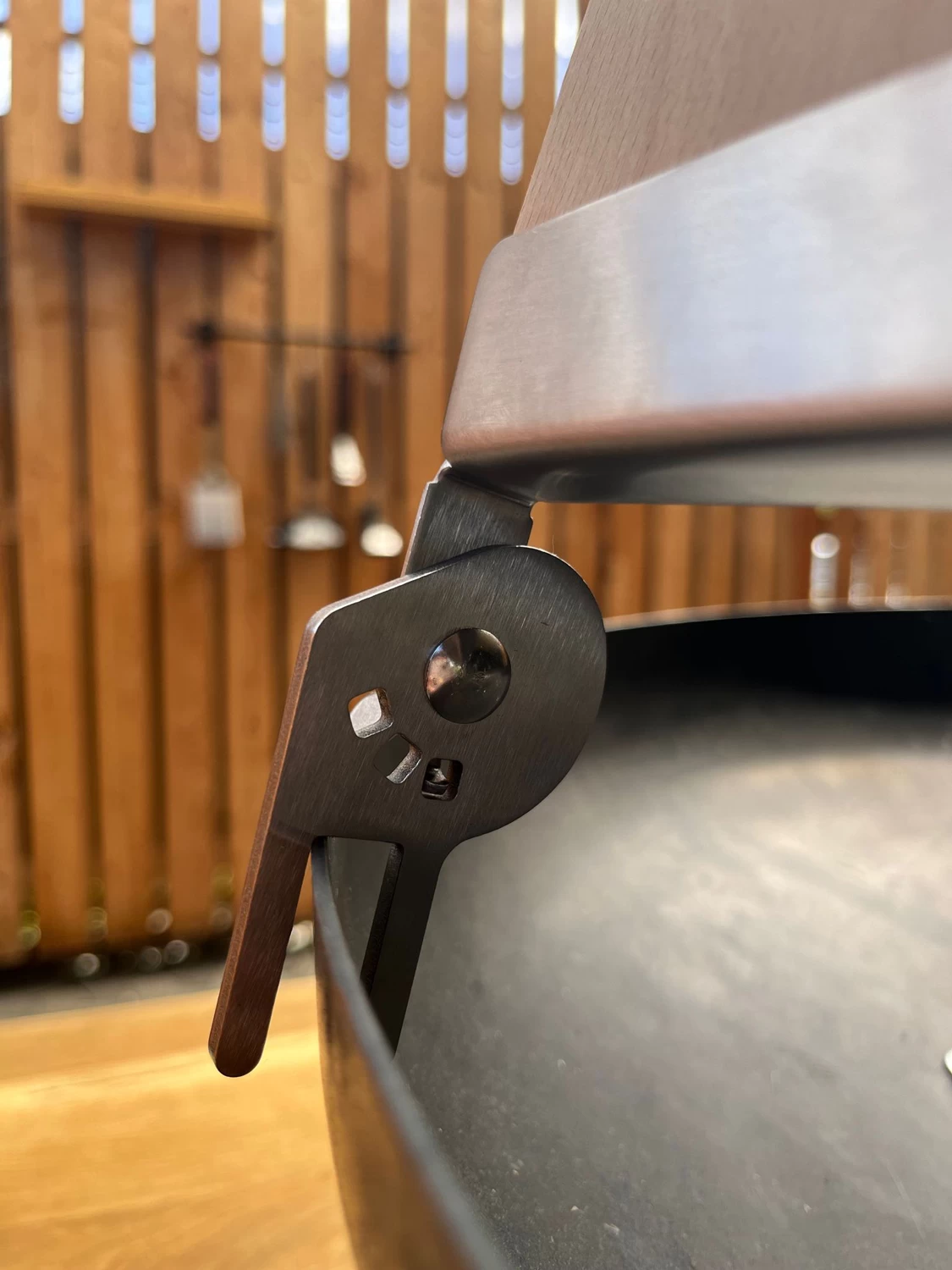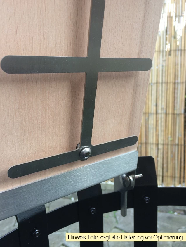 Durch die optimierte Halterung kann das Brett nicht mehr im Winkel von alleine nach vorn verrutschen. Anstelle der stufenlosen Einstellmöglichkeit mit Hilfe der Flügelmuttern, besitzt die Halterung nun 3 Arretierungsmöglichkeiten in unterschiedlichen Winkeln. Damit ist der Lachs nun absolut sicher über den Flammen befestigt.