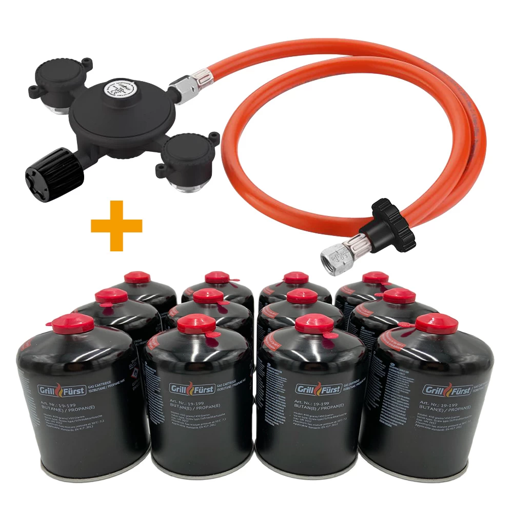 Der Grill kann – statt mit dem mitgelieferten 50 mbar Druckregler für handelsübliche 5, 8 und 11 kg Gasflaschen – mit einem neuen Druckminderer für Kartuschen ganz einfach umgerüstet werden. Dazu einfach den im Lieferumfang befindlichen Gasflaschen Druckminderer demontieren und einen Anschluss für handelsübliche Schraubkartuschen am Schlauch montieren.