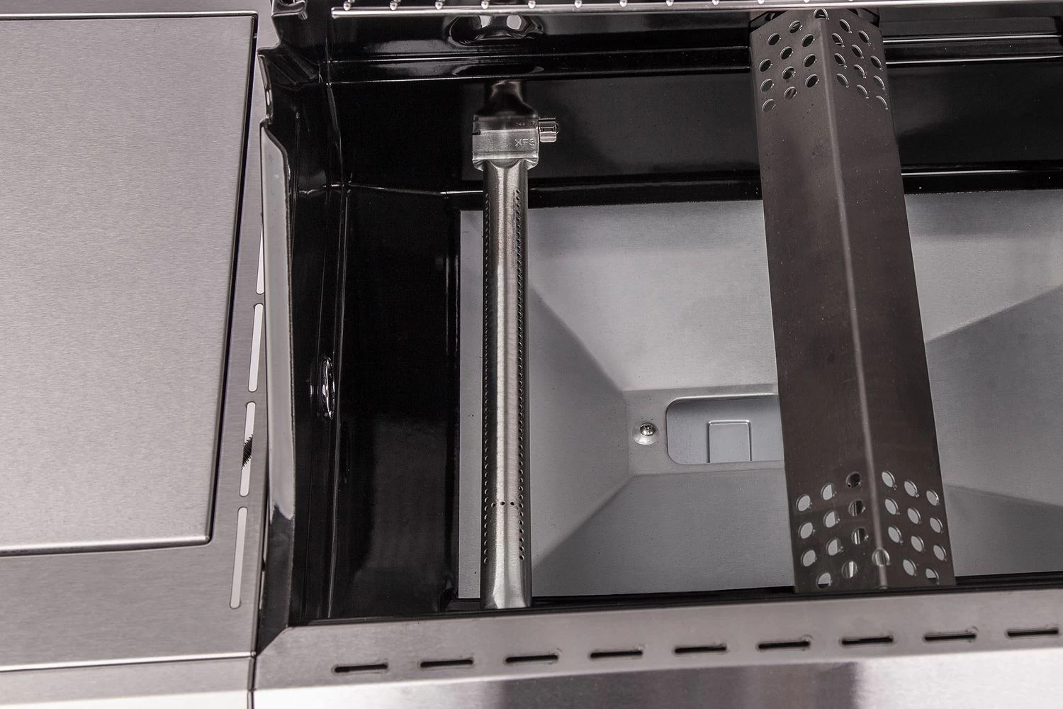 Der Infrarotbrenner besteht aus einem Keramikbrenner und wird durch ein Edelstahlblech vor Verschmutzungen und Fettspritzern geschützt. Das Edelstahlblech sorgt zusätzlich für eine besonders gleichmäßige Hitzeabstrahlung an das Grillgut.