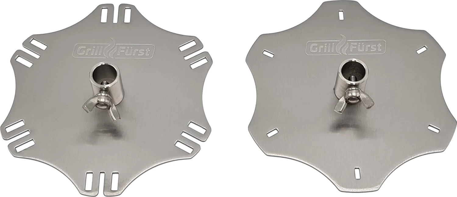 Das Grillfürst Halter-Set besteht aus zwei Edelstahl-Halteplatten und ist mit dem Grillfürst Drehspieß-Schaschlikset sowie mit den Grillfürst Edelstahl Spießen (45 cm und 60 cm) kompatibel.