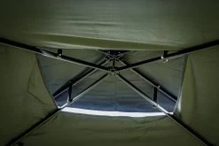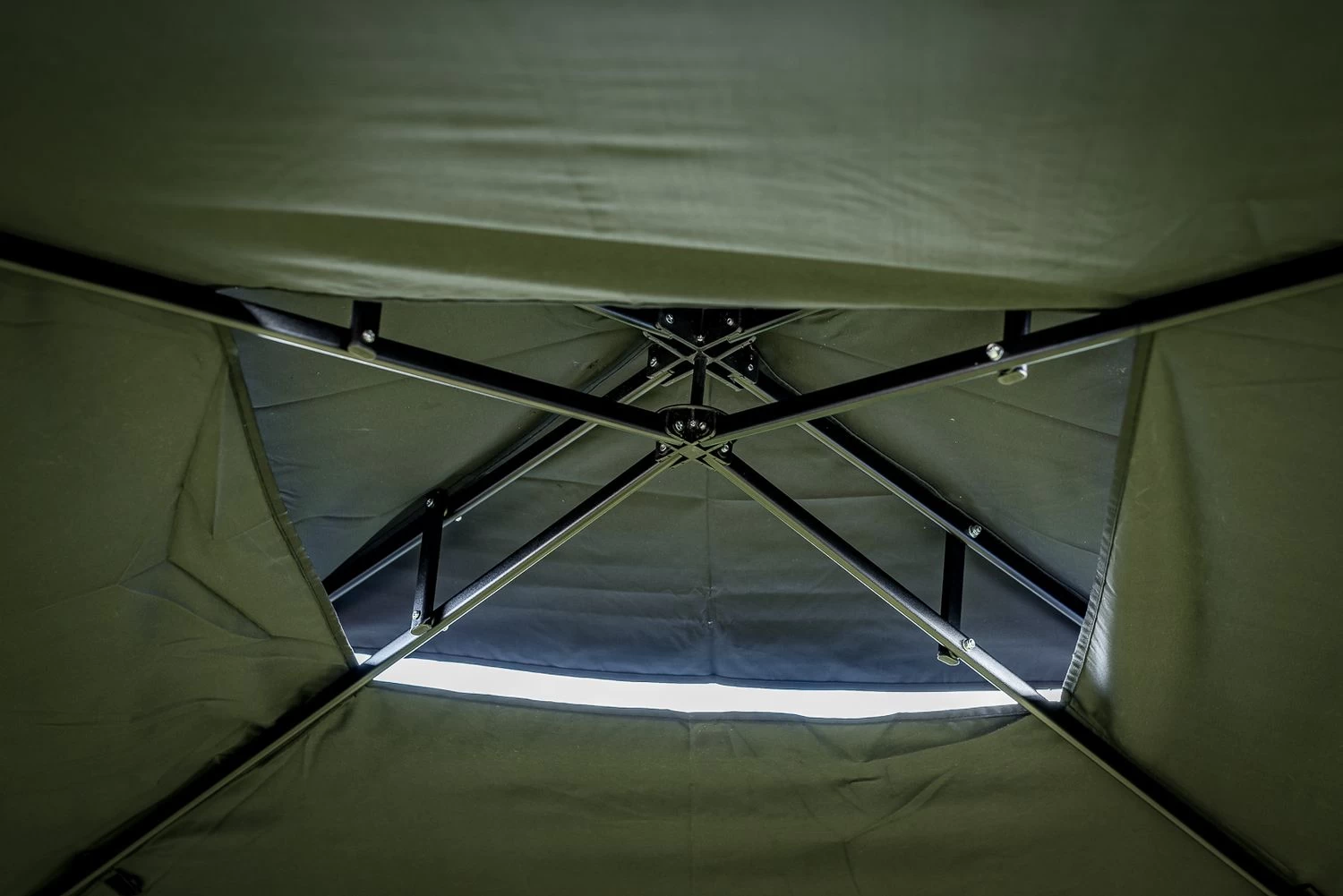 Das wasserdichte Dach mit einer Spezialbeschichtung ist das Highlight dieses tollen Pavillons. In der Mitte der Konstruktion ist eine Öffnung eingearbeitet, durch die der Rauch und Qualm des Grills prima abziehen kann. Darüber sitzt ein weiteres kleines Dach als Abdeckung der Öffnung. Dieses durchdachte System vehindert zuverlässig, dass sich Rauch, Stauwärme und Kondensat unter dem Dach sammeln können und sorgen für ein angenehmens Klima am Grill.