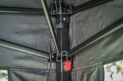 Einfach den Pavillon aus der praktischen Tragetasche nehmen, positionieren und auseinanderziehen, Abdeckung befestigen, die Beine ausziehen und arretieren – schon ist der Pavillion aufgebaut.