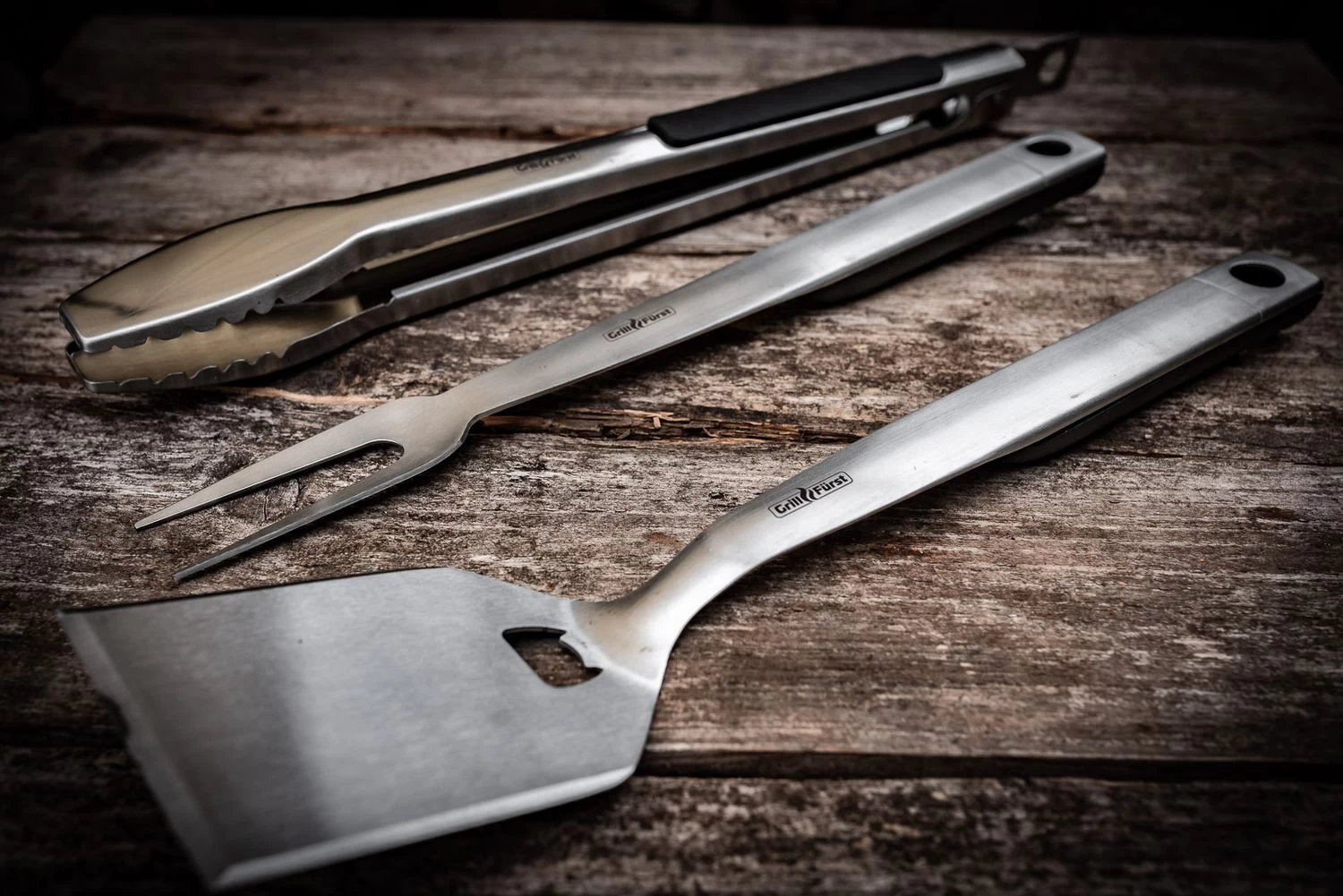 Das Premium Grillbesteckset beinhaltet „alles was du brauchst“. Gleich 3 hochwertige Grillhelfer aus Edelstahl: Grillzange, Grillwender und Grillgabel.