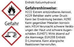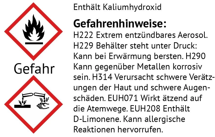 H222 Extrem entzündbares Aerosol. H229 Behälter steht unter Druck: Kann bei Erwärmung bersten. H290 Kann gegenüber Metallen korrosiv sein. H314 verursacht schwere Verätzungen der Haut und schwere Augenschäden. EUH071 Wirkt ätzend auf die Atemwege. EUH208 Enthält D-Limonene. Kann allergische