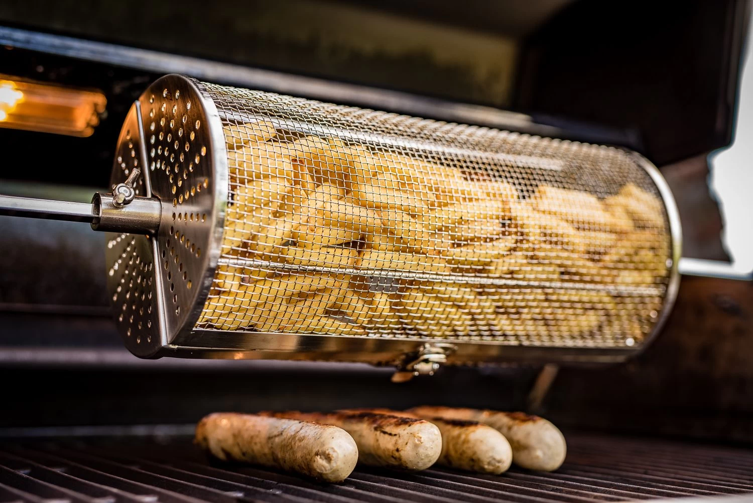 Jetzt sind Ihrer Kreativität keine Grenzen gesetzt: Besonders gut gelingen in dem Rotisseriekorb knusprige Pommes, Kartoffel Wedges oder auch leckere geröstete Kartoffelscheiben. Durch das besonders feine Drahtgeflecht ist es möglich, auch sehr kleines Grillgut perfekt zu garen, ohne dass etwas herausrutscht. Auch Popcorn kann auf diese Weise einfach direkt am Grill zubereitet werden.